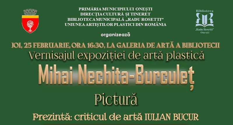 La Biblioteca Municipală „Radu Rosetti” din Onești va avea loc, joi, 25 februarie, de la ora 16.30, în Galeria de Artă, vernisajul expoziției de pictură a cunoscutului artist plastic Mihai Nechita-Burculeț. Evenimentul va fi prezentat de criticul de artă Iulian Bucur.
