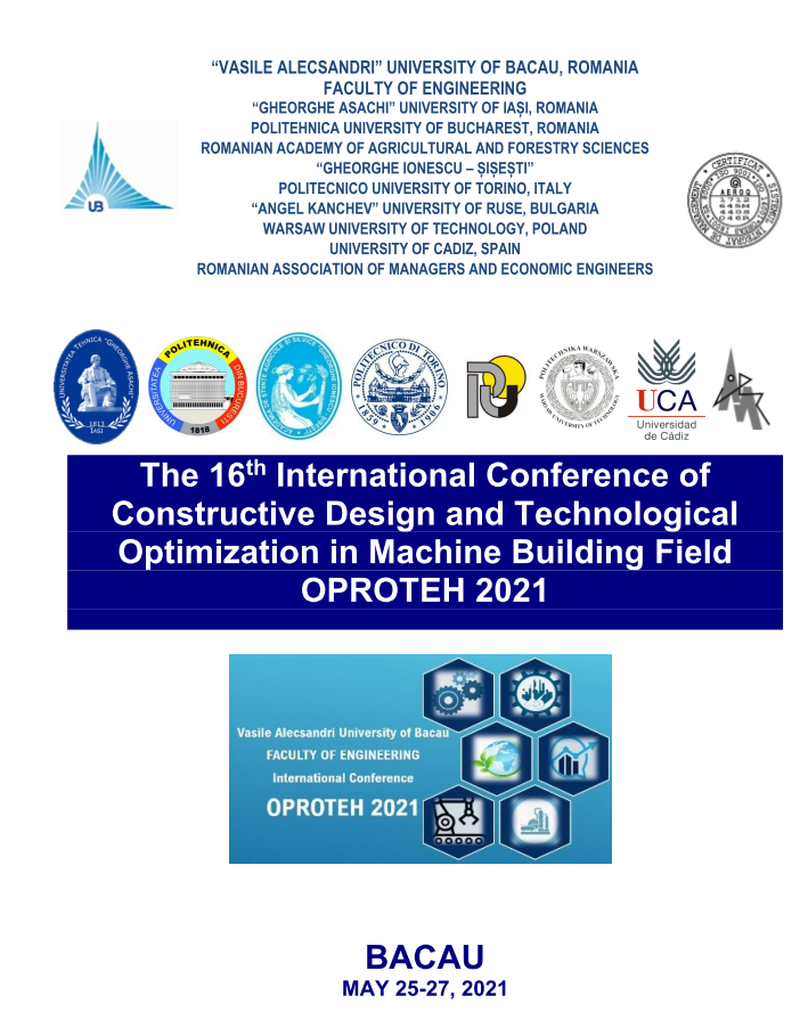 La Facultatea de Inginerie a Universității „Vasile Alecsandri” din Bacău a avut loc, pe 25 mai 2021, deschiderea oficială a Conferinței Internaționale – Constructive Design and Technological Optimization in Machine Building – OPROTEH 2021, ediția a XVI-a. Conferința se desfășoară online pe platforma TEAMS a Universității, în perioada 25 -27 mai 2021. Programul conferinţei cumulează 7 secţiuni unde sunt înscrise 189 lucrări ale cadrelor didactice și cercetătorilor din Franţa, Canada, USA, Marea Britanie, Ungaria, Polonia, Nigeria, Algeria, Senegal, Thailanda, Tunisia, Spania, Republica Moldova şi România. Cele șapte secțiuni tratează variate arii tematice din domenii, precum: optimizarea proceselor și sistemelor de fabricație și proiectare asistate de calculator, optimizarea tehnologiilor și echipamentelor din industriile de proces, optimizarea în ingineria și protecția mediului, mecatronică și robotică, inginerie economică, inginerie chimică și alimentară, energetică industrială și știinta calculatoarelor.