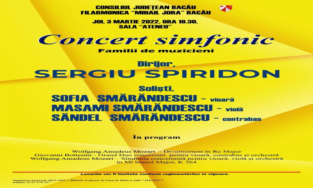 Orchestra dirijată de Sergiu Spiridon – violonist al Filarmonicii Mihail Jora, profesor de dirijat al Orchestrei Colegiului Național de Artă George Apostu, un muzician ce conduce cu succes și alte ansambluri simfonice din țară – va interpreta Divertismentul în Re Major de W.A. Mozart și va acompania soliștii în paginile Grand Duo-ului concertant de Giovanni Bottesini și ale Simfoniei concertante K 364 de Mozart.