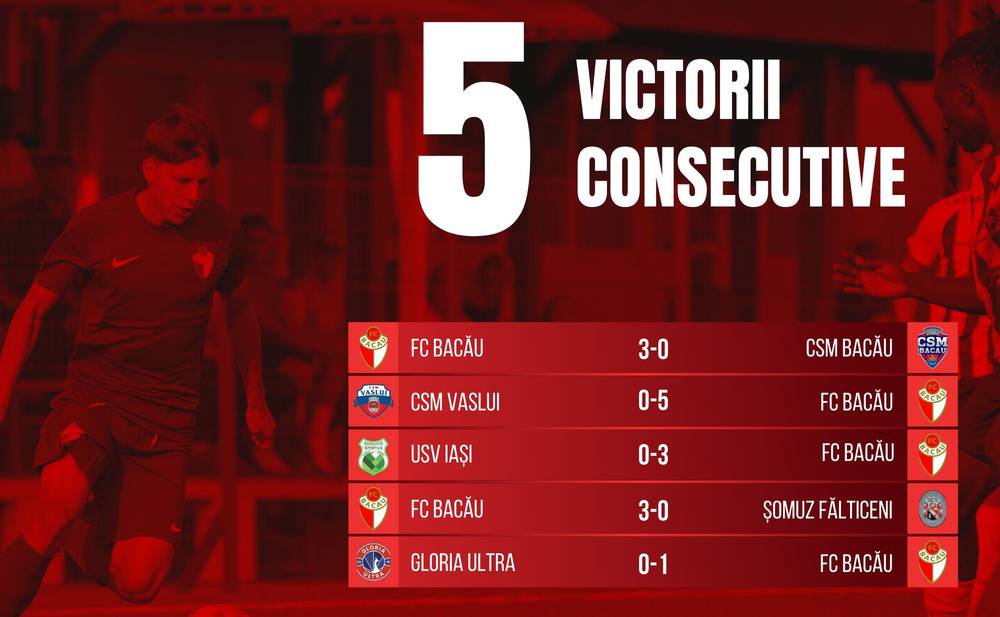 Victoria obținută de FC Bacău în etapa a XII-a a Ligii 3, împotriva Gloriei Ultra, a marcat un moment istoric pentru club. Cu acest succes, echipa antrenată de Costel Enache a ajuns la cinci victorii consecutive în campionat, stabilind un nou record pentru cea mai lungă serie de succese din istoria sa.