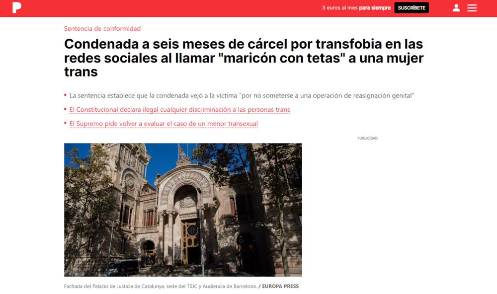 O femeie din Barcelona a fost condamnată la șase luni de închisoare și o amendă de 720 de euro pentru un delict împotriva drepturilor fundamentale și libertăților publice. În sentința sa, instanța consideră că inculpata, „ghidată de intenția de a umili” o femeie trans „pentru că nu s-a supus unei operații de reasignare genitală”, a trimis mesaje pe rețelele sociale în care „disprețuia” victima.