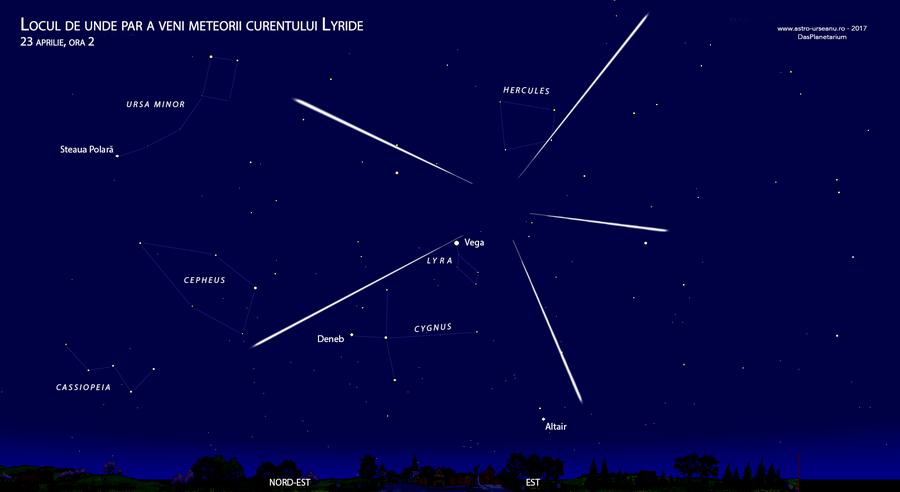 În fiecare an la sfârșitul lunii aprilie avem ocazia să admirăm curentul meteoric Lyride. Curenții meteorici sunt cunoscuţi şi sub denumirea populară de „ploi de stele căzătoare”. Curentul meteoric Lyride este activ în perioada 16 – 25 aprilie şi este unul dintre cele mai vechi observate, primele fiind făcute de chinezi acum 2700 de ani (în anul 687 î.e.n.).