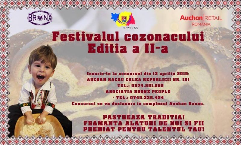 Complexul comercial Auchan din Bacău va fi, în zilele de 13 și 14 aprilie, gazda celei de a doua ediții a Festivalului Cozonacilor și a Târgului de produse locale, organizate prin proiectul „Se poate și aici” de Asociația BronxPeople Bacău. Manifestările au fost prezentate într-o conferință de presă organizată la Direcția pentru Agricultură Județeană, eveniment la care au participat Simona Mirela Barzaghideanu – directorul executiv al instituției, Gigi Mandici – directorul magazinului Auchan Bacău, Daniel Zodian și Ionuț Ailenei – de la Asociația BronxPeople.