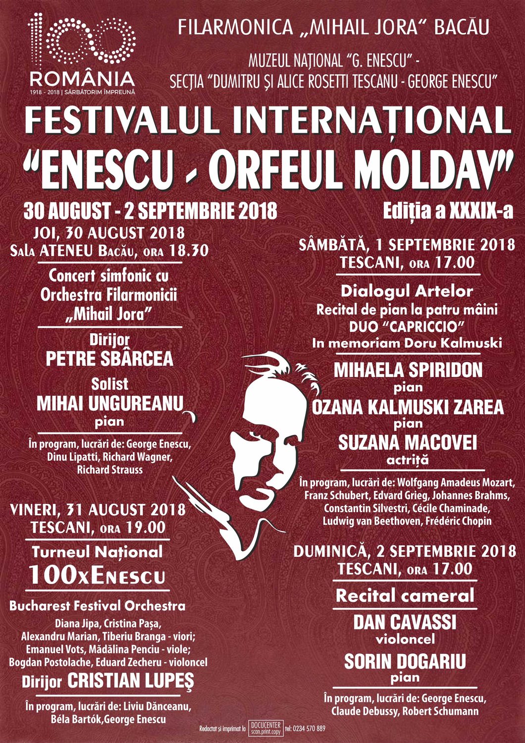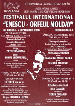 Festivalul “Enescu – Orfeul Moldav”- amplă şi de tradiţie manifestare care şi-a propus integrarea marilor opere muzicale în circuitul viu al prezentului, stimularea artei componistice şi interpretative, o mai bună cunoaştere şi valorificare a creaţiei enesciene, se desfăşoară în perioada 30 august – 2 septembrie, la Sala “Ateneu” din Bacău şi la Tescani, secţia “Dumitru şi Alice Rosetti Tescanu” a Muzeului Naţional “George Enescu”.