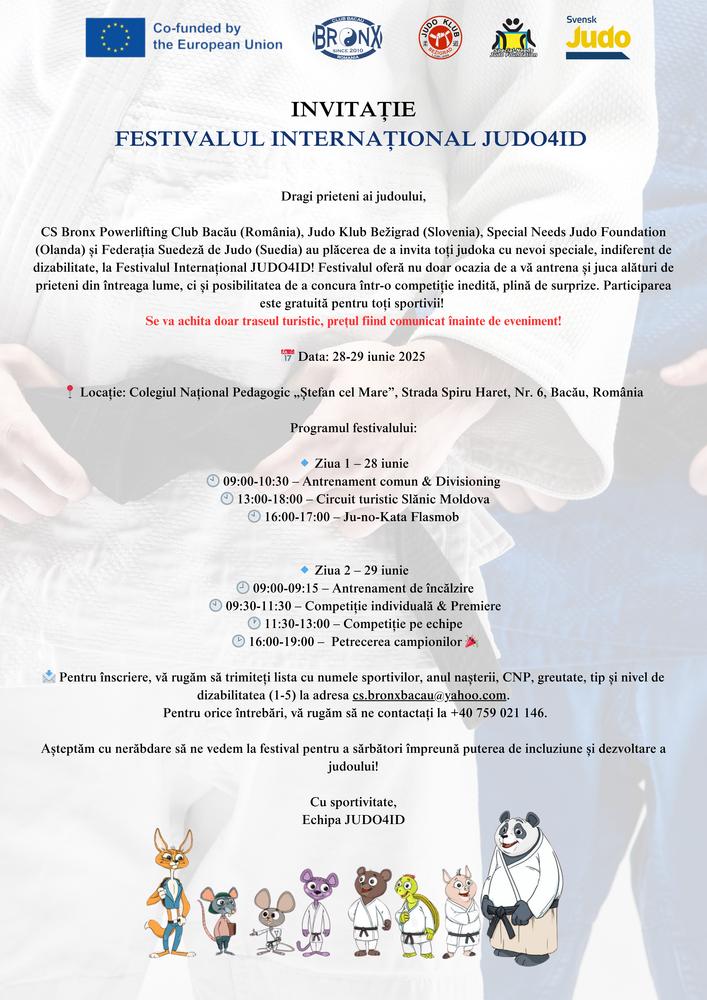 În perioada 27-29 iunie, CS Bronx Powerlifting Club Bacău va organiza Festivalul Internațional JUDO4ID, care marchează finalul proiectului JUDO4ID – Integrating Children with Intellectual Disabilities in Sports. Evenimentul va fi găzduit de Colegiul Național Pedagogic ,,Ștefan cel Mare’’ Bacău, un partener de drum lung al clubului, promotor al incluziunii sociale în și prin sport, și va reuni cele patru organizații ce formează consorțiul de implementare a proiectului – CS Bronx Powerlifting Club Bacău, Judo Klub Bežigrad, Special Needs Judo Foundation și Federația Suedeză de Judo, alături de sportivi din România și Slovenia.