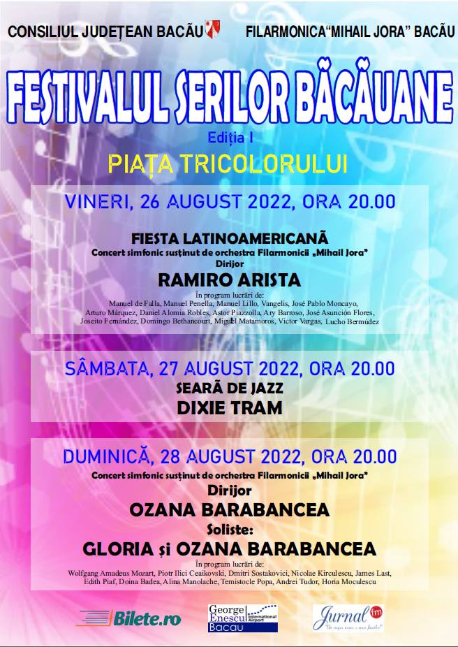 În această seară debutează ediția I a Festivalului serilor băcăuane, după trei ediții ale Serilor diasporei. Organizat de Filarmonica Mihail Jora, sub egida Consiliului Județean, Festivalul se desfășoară în Piața Tricolorului, de vineri până duminică, de la ora 20.00. Fiesta latino Americana este primul concert, susținut de Orchestra simfonică a Filarmonicii Mihail Jora, sub bagheta dirijorului argentinian Ramiro Arista.
