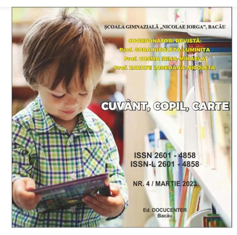 Concursul de creație „Cuvânt, copil, carte”, Ediția a IV – a, a urmărit stimularea imaginației și a creativității verbale și artistice a elevilor prin crearea de către aceștia a unor compoziții pentru concursul desfășurat în mediul online pe 3 martie 2023. 52 de elevi din învățământul preșcolar și primar au participat la secțiunile de creație literară, iar 35 de elevi cu cerințe educașionale speciale au trimis lucările lor artistice pentru secțiunea dedicată lor. Organizatorii concursului, prof. Zavate Loredana-Nicoleta, prof. Cosma Irina-Mihaela și prof. Gora Nicoleta-Luminița, sunt și coordonatorii cărții electronice „Cuvânt, copil, carte” apărute la Editura Docucenter, Bacău. Referent științific a fost lect. univ. dr. Ioana Boghian de la Universitatea „Vasile Alecsandri” din Bacău, iar colaboratorii noștri au fost: prof. Roșca Elena – inspector școlar de specialitate pentru educație timpurie, ISJ Bacău, prof. Ștefan Mariana – inspector școlar de specialitate pentru educație timpurie, ISJ Bacău, prof. Vornicu Ana-Ioana – inspector Limba și literatura română, ISJ Bacău, prof. dr. Droiman Oana Maria – inspector școlar învățământ special, ISJ Bacău, prof. Sandu Ionela – inspector Arte, ISJ Bacău,Vrabie Adriana – profesor de Educație tehnologică la Șc. Gimn. „Miron Costin”, Bacău, Costea Cristina Oltea – profesor de Limba și literatura română și director la Șc. Gimn. „Nicolae Iorga”, Bacău, Popa Mihaiela Cezara – profesor de chimie și director adjunct la Șc. Gimn. „Nicolae Iorga”, Bacău, pr. dr. Pleșcău Ionuț -Biserica „Sfîntul Dimitrie” Bacău.