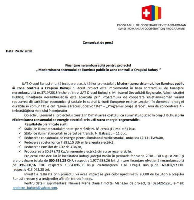 Comunicat de presăFinanțare nerambursabilă pentru proiectul „ Modernizarea sistemului de iluminat public în zona centrală a Orașului Buhuși “de Comunicat de presa - 23 iulie 2018AcțiuneFacebookTwitterWhatsAppTelegramVK