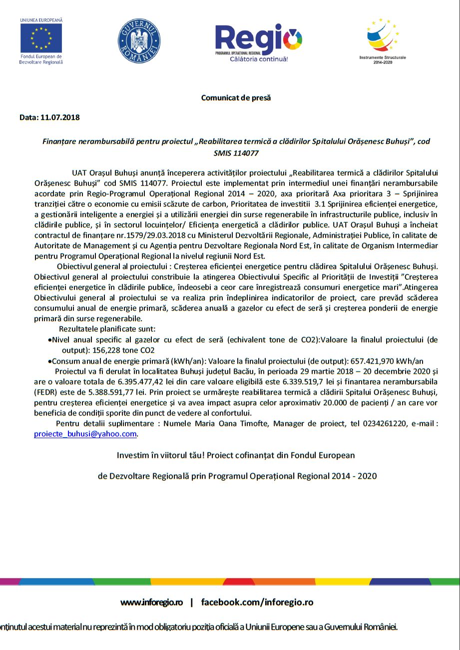 Comunicat de presăFinanțare nerambursabilă pentru proiectul „Reabilitarea termică a clădirilor Spitalului Orășenesc Buhuși”, cod SMIS 114077de Deșteptarea - 10 iulie 2018AcțiuneFacebookTwitterWhatsAppTelegramVK
