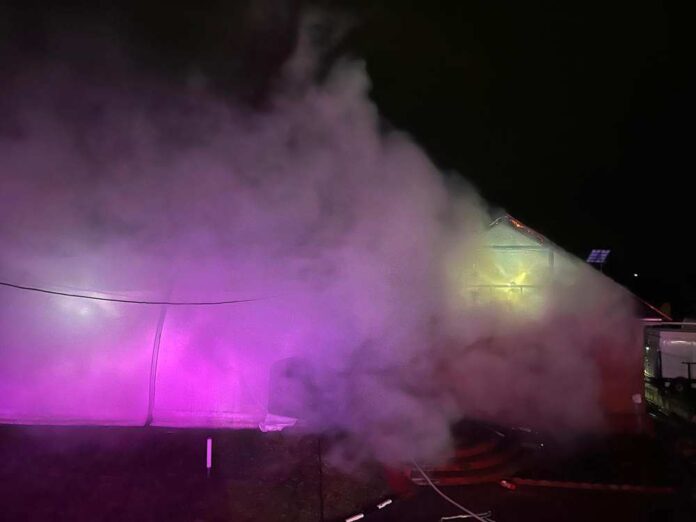 The blaze destroyed a single-story plus attic structure covering approximately 300 square meters, along with the contents inside, as well as an event tent spanning about 100 square meters.