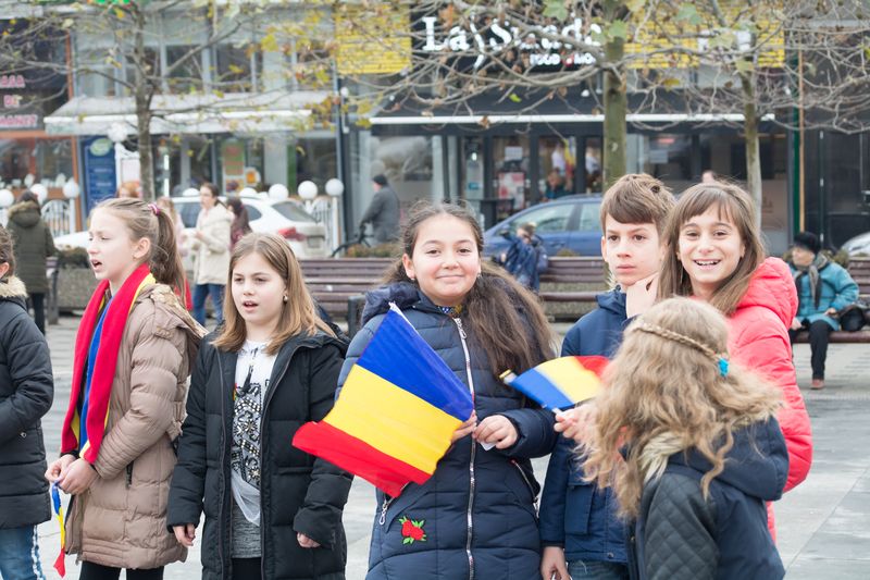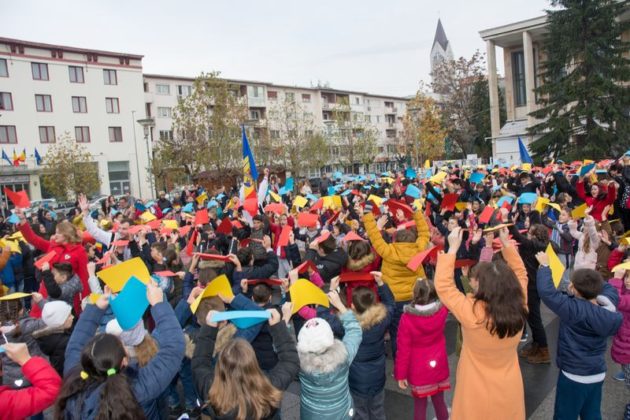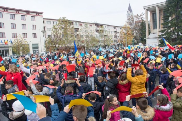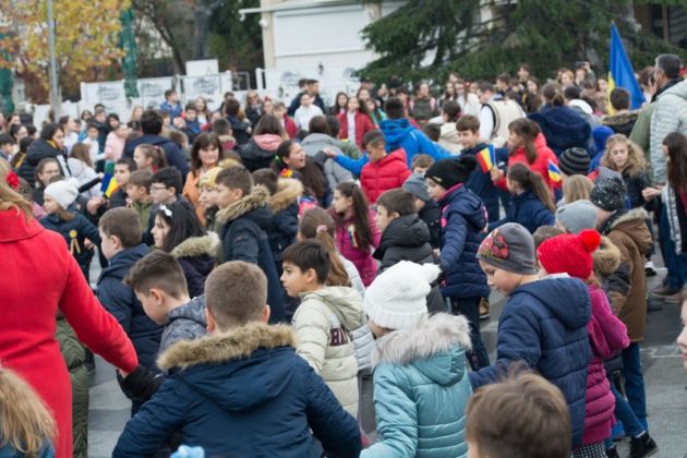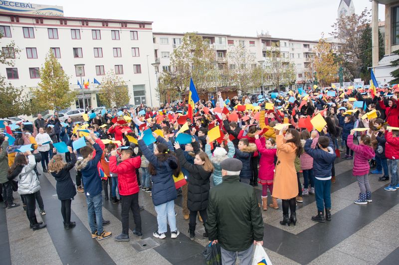 500 de copii de la Școala Gimnazială “Mihail Sadoveanu” din Bacău au dansat în fața Casei de Cultură într-un flashmob organizat cu ocazia Zilei Naționale a României.