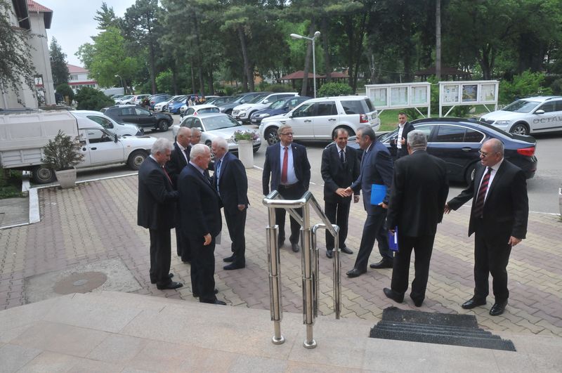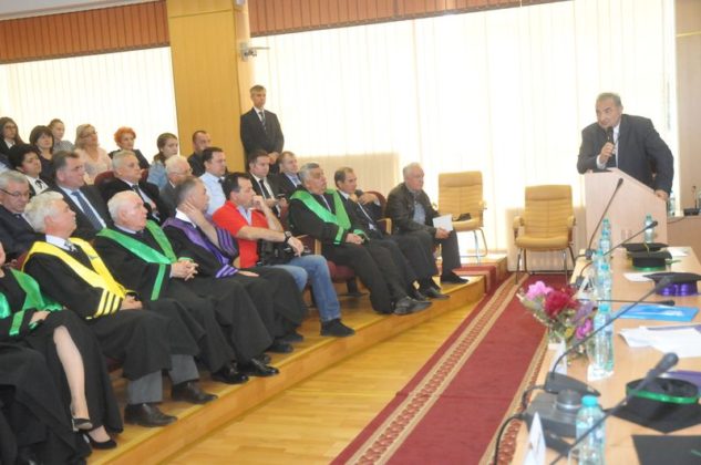 La masa prezidiului ceremoniei au luat loc, din partea Universității „Vasile Alecsandri”, prof. univ. dr. ing. dr.h.c. Valentin Nedef – preşedintele Senatului, prof. univ. dr. ing. Carol Schnakovszky – rector, prof. univ. dr. Ovidiu Turcu, decanul Facultății de Științe Economice, conf. univ. dr. Marcela-Cornelia Danu – prorector, conf. univ. dr. Costel Ceocea, prof. univ. dr. Mihai Deju – directorul Departamentului Contabilitate, Audit și Analiză Economico-Financiară al Facultăţii de Ştiinţe Economice, și prof. univ. dr. Marin Dinu – Academia de Studii Economice din Bucureşti, membru al CA al BNR.