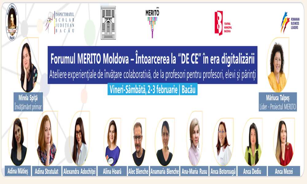 Pe 2-3 februarie, peste 200 de profesori, directori, elevi şi părinţi, din regiunea Moldovei şi din ţară, sunt invitaţi să participe gratuit la a doua ediţie a Forumului MERITO Moldova, cu tema „Întoarcerea la „DE CE” în era digitalizării”, privind problematici specifice, de didactica disciplinei, ce modifică practicile la clasă. Evenimentul se va desfăşura fizic, pentru prima oară în Bacău, la Teatrul Municipal Bacovia şi la Şcoala Gimnazială ”Alexandru Ioan Cuza”.