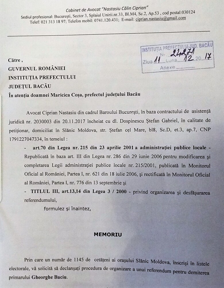 Luni, la prânz (11 decembrie), la Registratura Instituției Prefectului din Bacău a fost depus un memoriu prin care 1145 de cetățeni ai orașului stațiune Slănic Moldova, înscriși în listele electorale, solicită declanșarea procedurii de organizare a unui referendum pentru demiterea primarului Gheorghe Baciu. Memoriul are 27 de pagini și cuprinde motivele pentru care a fost conceput și depus. Petiționarii au apelat la un avocat foarte cunoscut în breaslă, Ciprian Nastasiu, din Baroul București. În termen de 30 de zile, conform legii, petiționarii așteaptă soluționarea cererii lor.
