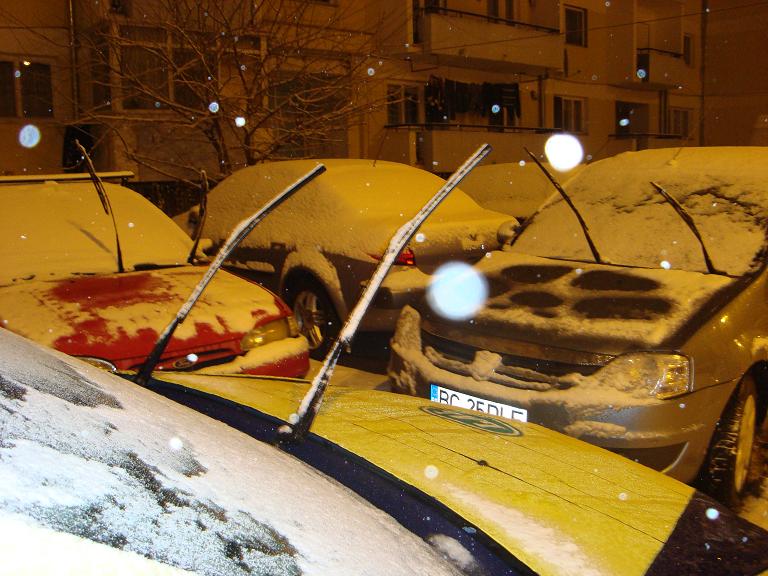 Tarziu in noapte, pe aleile neumblate, se mai zareau doar urmele lasate de cate un caine hoinar. Parcarile erau cufundate intr-o lumina speciala, alimentata de albul zapezii si de galbenul becului de la stalpul de iluminat. Masinile aliniate in parcari, parca asteptau dimineata pentru a aluneca pe zapada, copacii se imbracau cu mantia alba, iar razlet se vedea cate un cuplu de indragostiti care se sarutau printre fulgii de zapada.