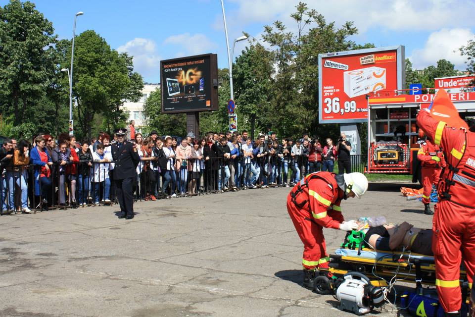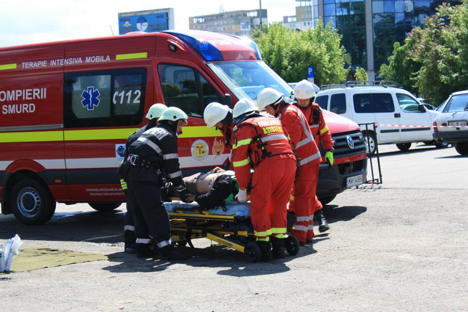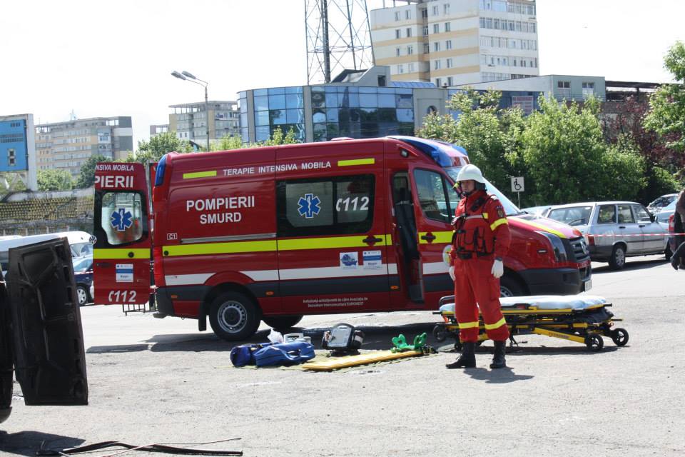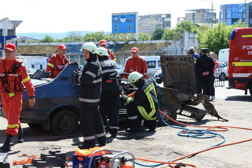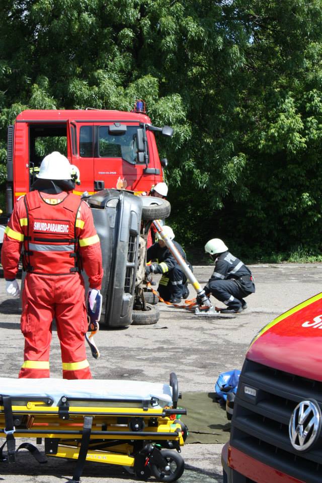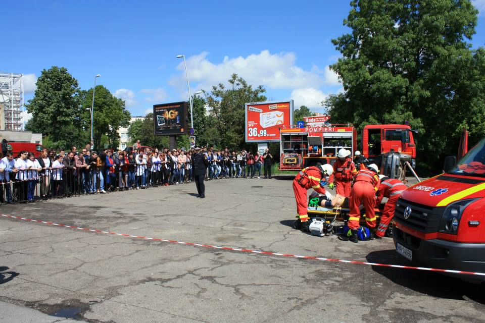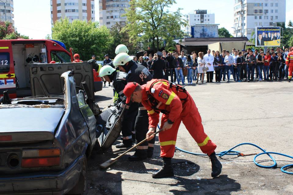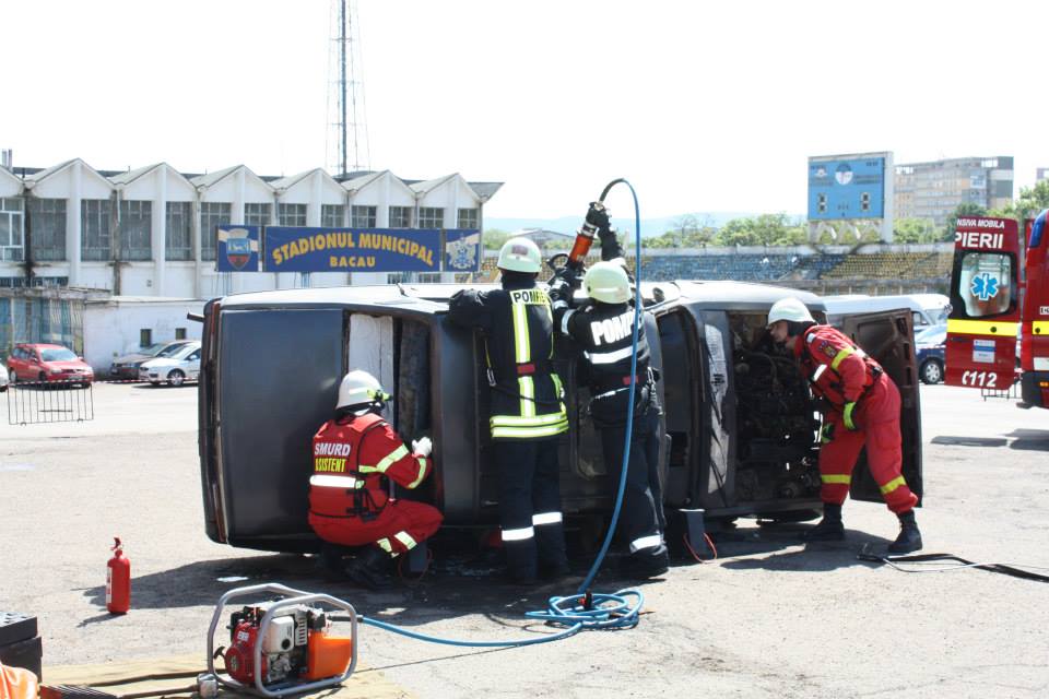 ISU Bacau, SMURD Bacau in colaborare cu Scoala Sanitara Postliceala Bacau au efectuat vineri, 16 mai 2014, in parcarea Stadionului Municipal Bacau, o demonstratie, exercitiu de interventie in caz de accident rutier.
