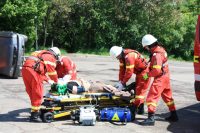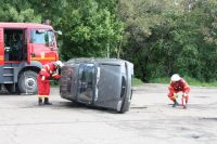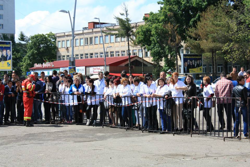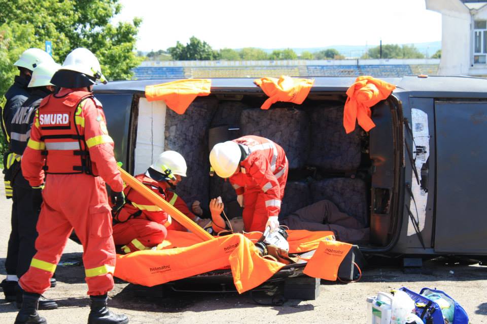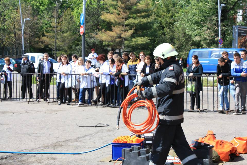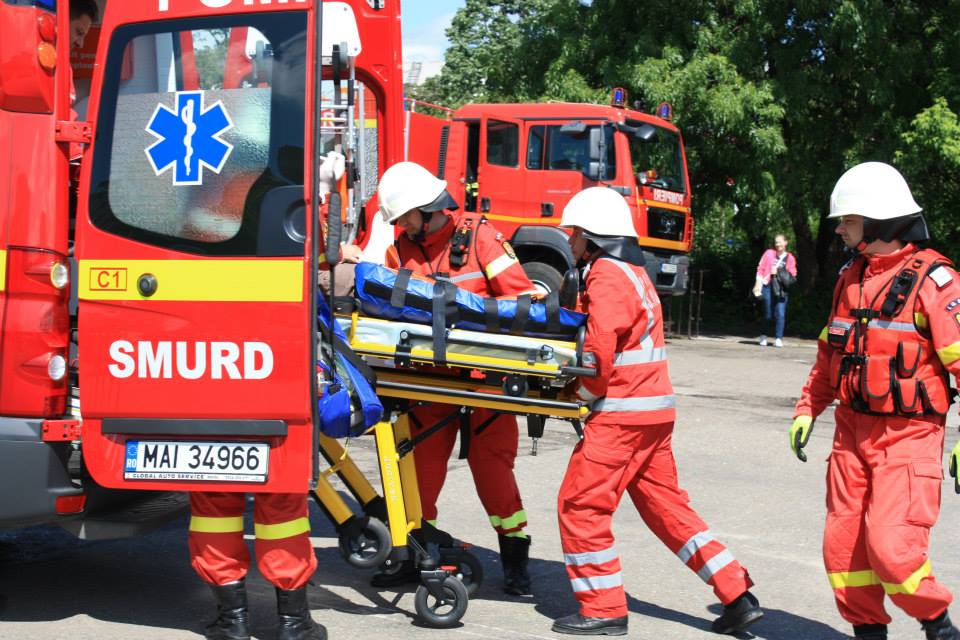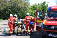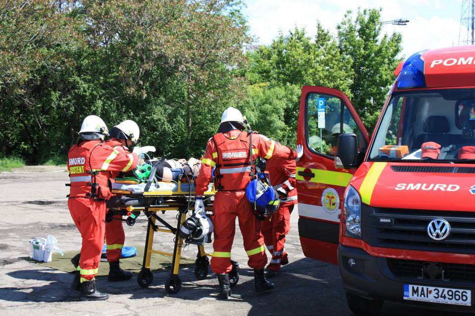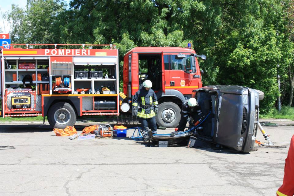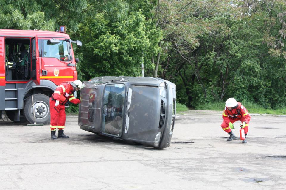ISU Bacau, SMURD Bacau in colaborare cu Scoala Sanitara Postliceala Bacau au efectuat vineri, 16 mai 2014, in parcarea Stadionului Municipal Bacau, o demonstratie, exercitiu de interventie in caz de accident rutier.
