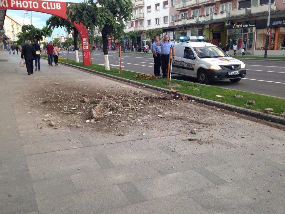 FOTO: O jardiniera de beton de la un bloc din centrul Bacaului s-a prabusit pe trotuar