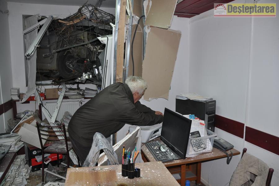 O grinda de beton din structura de rezistenta a oprit inaintarea masinii, care in lipsa acestui obstacol ar fi aterizat pur si simplu pe biroul asociatiei. Acul vitezometrului a ramas blocat la valoarea de 90 km/ora, iar martorii evenimentului spun ca viteza ar fi fost si mai mare.