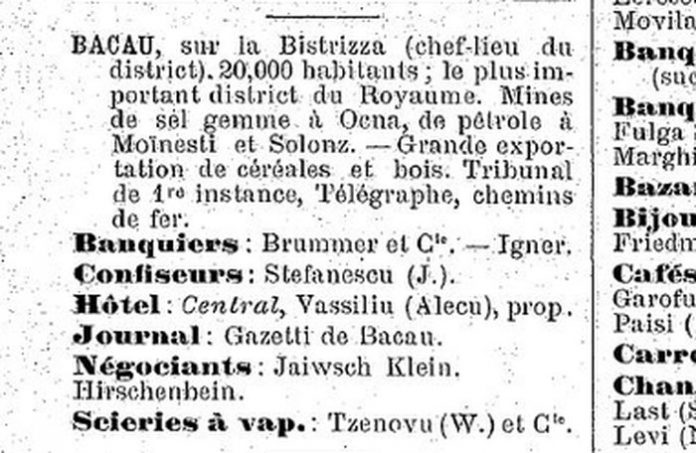 Intr-un anuar publicat in Franta, la 1891, judetul Bacau era prezentat drept „cel mai important judet din regat”. Importanta sa era data de economie: exploatare de sare la Tg Ocna si de petrol la Moinesti si Solont. Judetul era si mare exportator de cereale si lemn.