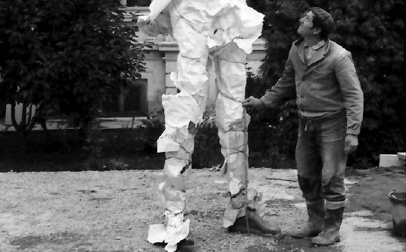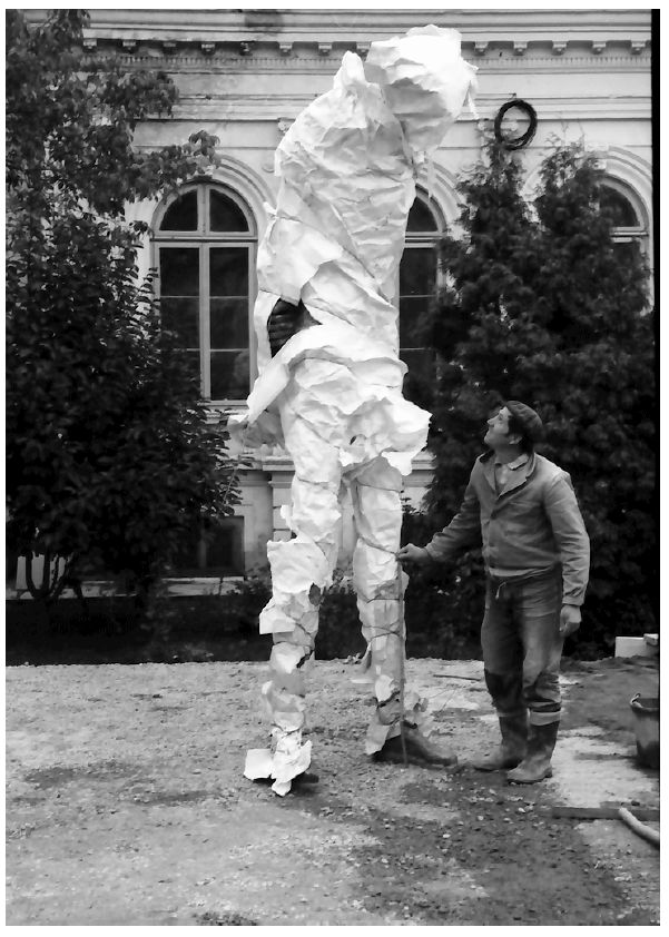 Pragher a realizat in 1971 mai multe fotografii in Bacau, intre care si aceasta, cu statuia lui George Bacovia inca infasurata in hartii, pentru a nu fi vazuta de oameni inainte de dezvelirea oficiala.