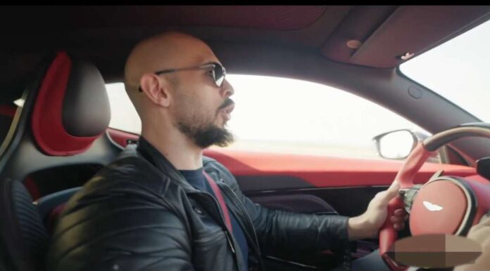 Frații Tate au făcut o intrare spectaculoasă în oraș, conducând un Aston Martin DBS 770 ediție limitată în crom închis cu detalii de carbon roșu, conform imaginilor prezentate în videoclip.