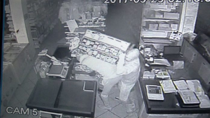 Pe imagini se vede cum doi indivizi, care au feţele acoperite, sar gardul, sparg lacătul de la uşa de acces şi ajung în interior de unde sustrag rapid 40 de cartuşe de ţigări, deschid şi casa de marcat, însă nu găsesc decât mărunţiş, după care părăsesc locul faptei.