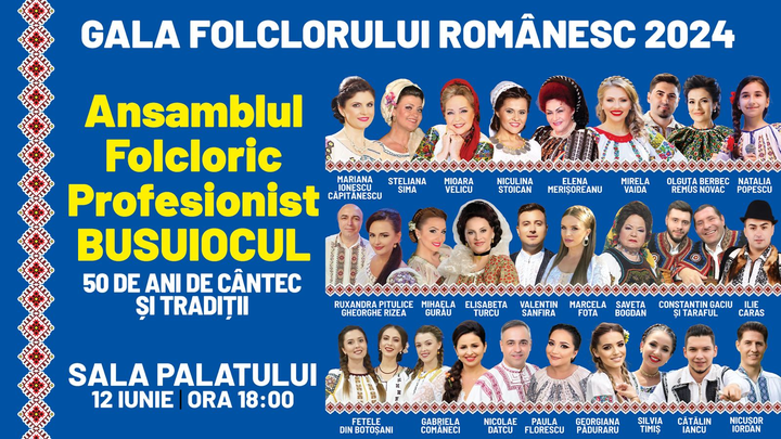 În data de 12 iunie 2024, sunteți invitați la Gala Folclorului Românesc, un eveniment deosebit organizat la Sala Palatului, pentru a sărbători 50 de ani de cântec și tradiții ai Ansamblului Folcloric Profesionist „Busuiocul” din Bacău.