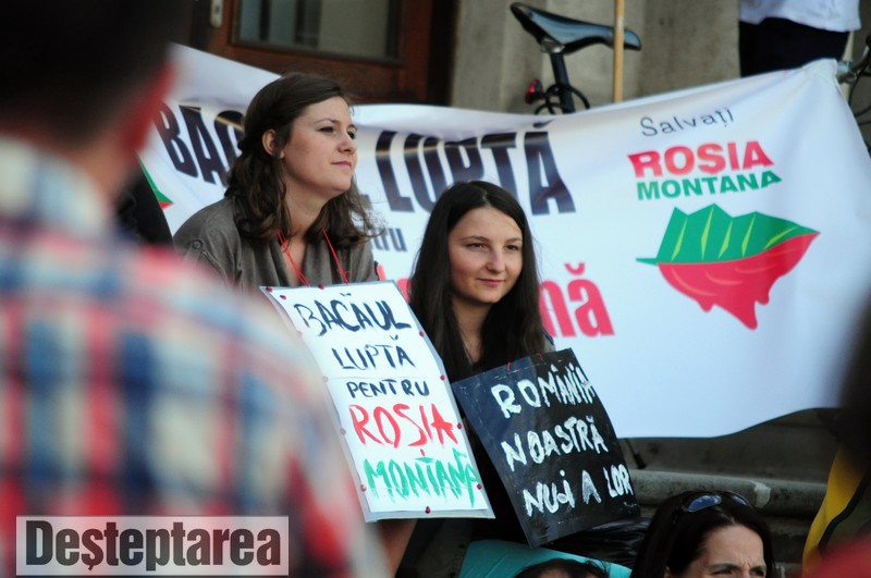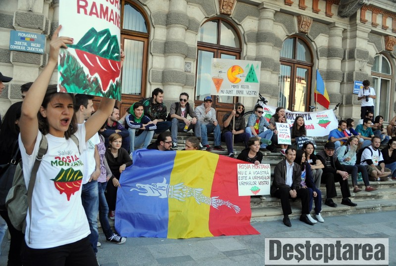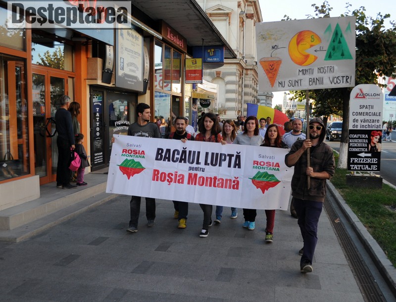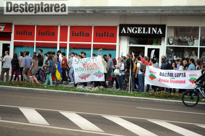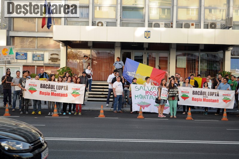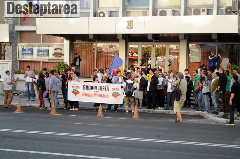 Peste 100 de bacauani s-au adunat duminica seara, in fata Prefecturii Bacau, pentru a protesta fata de proiectul minier de la Rosia Montana. In fata Prefecturii s-au strans semnaturi impotriva legii care ar urma sa acorde Gold Corporation puterea de a trece peste legile nationale, semnaturi care, au spus organizatorii, vor fi inmanate parlamentarilor bacauani.