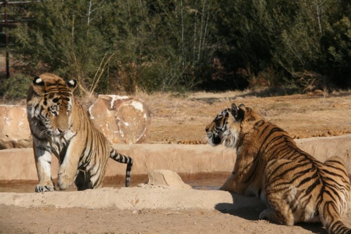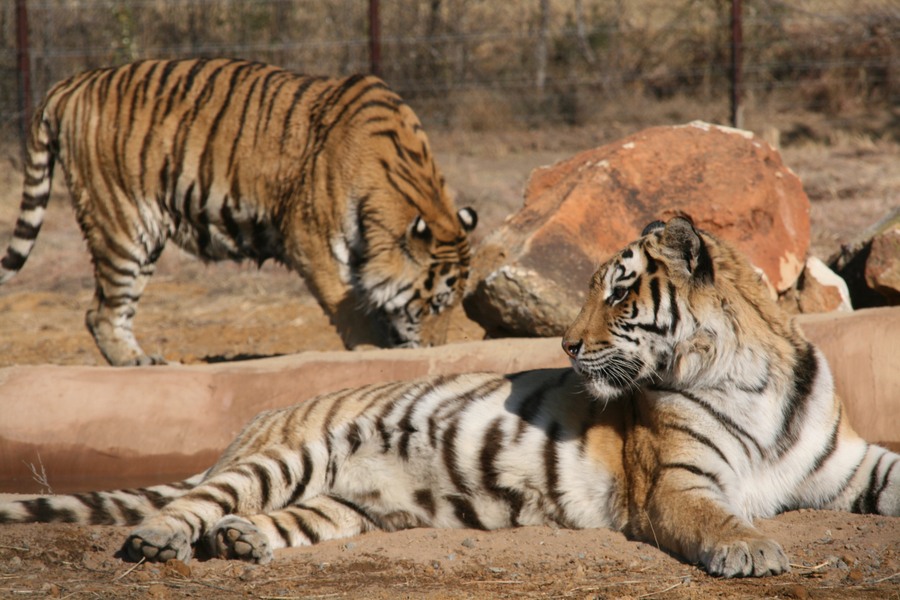 Tomia și Riwa, cei doi tigri salvați de VIER PFOTEN la începutul acestui an din grădina zoo de la Onești, județul Bacău, au fost eliberați într-un țarc nou, cu suprafața de un hectar, în perimetrul sanctuarului pentru feline mari de la LIONSROCK, Africa de Sud. Țarcul foarte larg, conceput special pentru nevoile acestei specii, va fi căminul permanent în care cei doi tigri își vor petrece restul vieții.