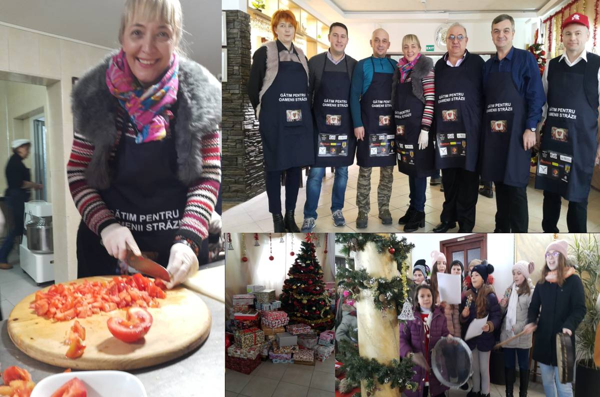 Invitații și angajații restaurantului au gătit ciorbă, gulaș și au pregătit pachete cu gustări pentru 250 de persoane fără adăpost. Masterchef Petrișor i-a îndrumat cu atenție, astfel ca „misiunea” să se desfășoare cu succes.