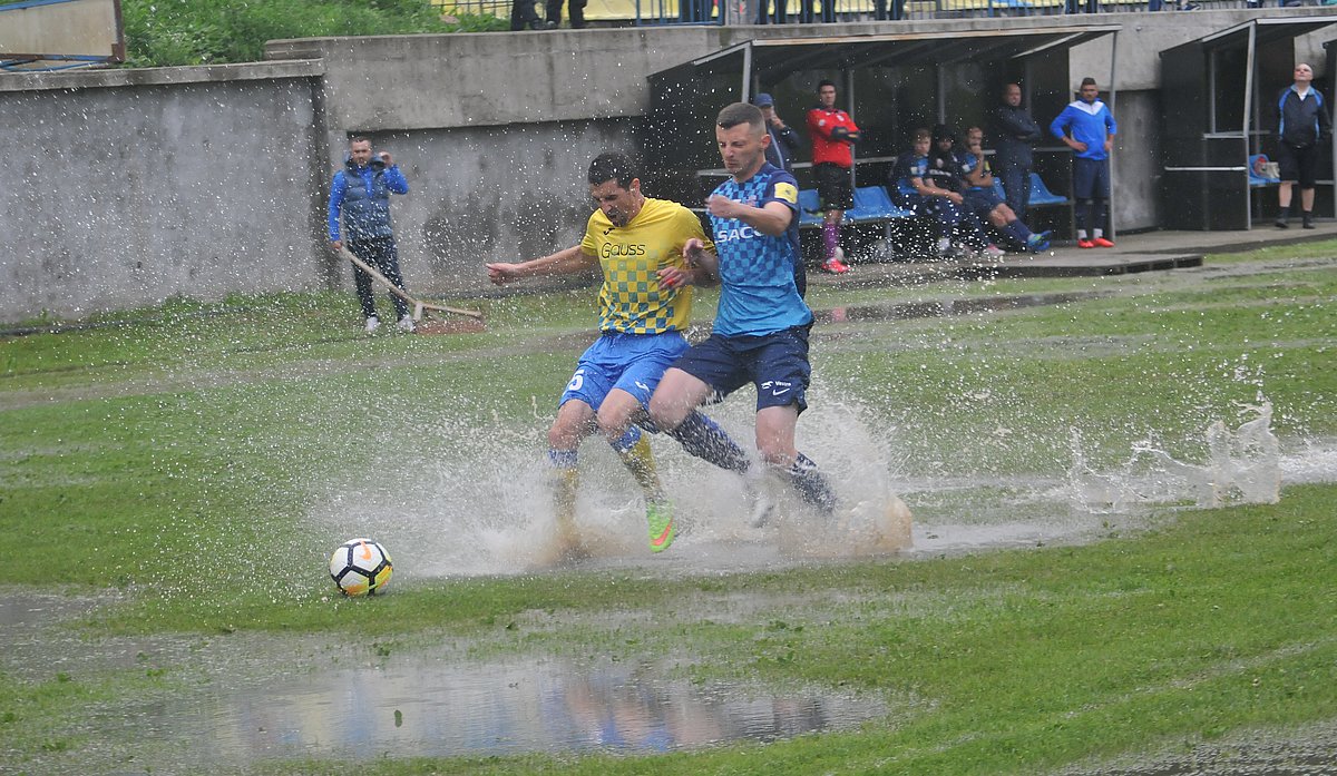 Manșa secundă a „barajului”, programată sâmbătă, a fost în pericol să nu se dispute deoarece o mare parte a terenului de pe stadionul „Letea” era acoperită de apă ca urmare a ploilor ce s-au abătut peste Bacău wekendul trecut.