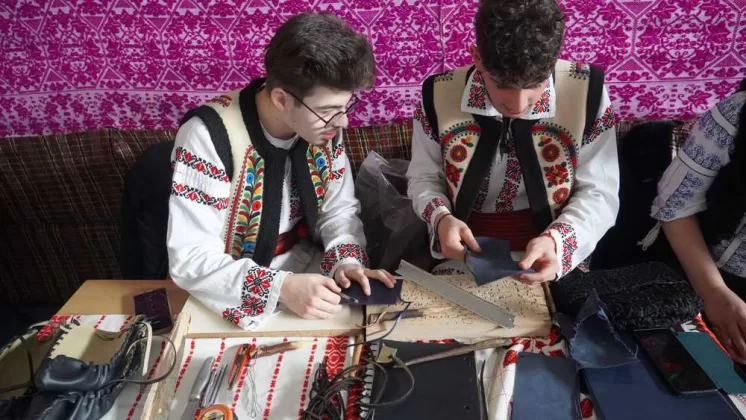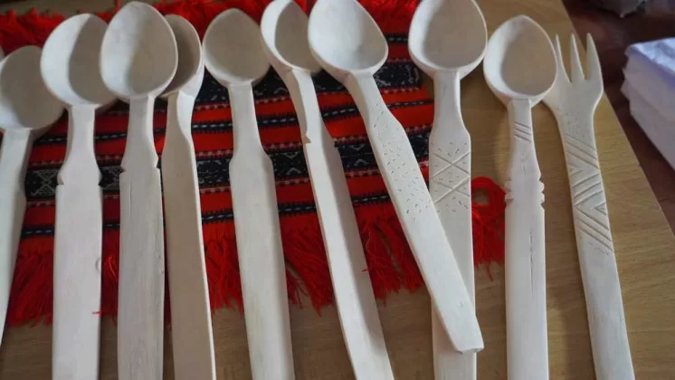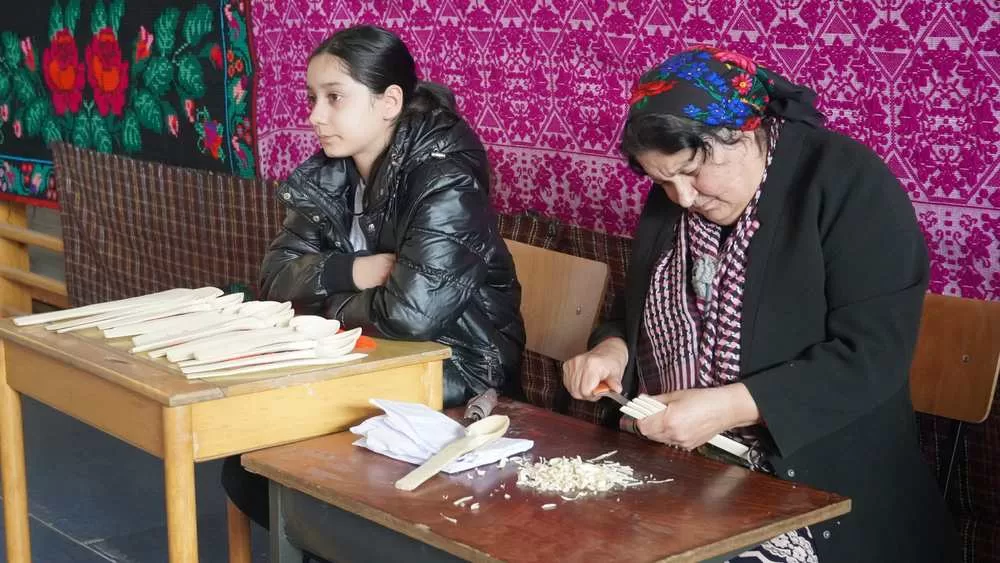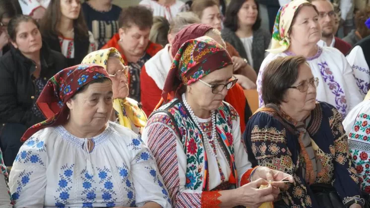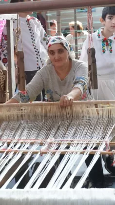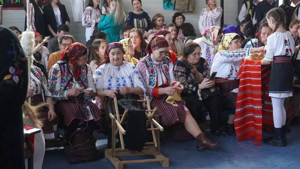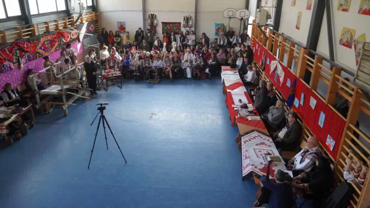 Pentru două ore, satul tradiţional românesc s-a mutat în sala de sport a Şcolii Gimnaziale „Io(a)n Strat” Gioseni. De o parte, în stânga, erau meşteşugarii: o echipă de lingurari, o alta de opincari şi, autoritar, o localnică aflată şi ea la lucru în faţa unui impresionant şi vechi război de ţesut lăicere. În spatele lor, un perete larg era acoperit cu mândre covoare moldoveneşti. În prim plan, alte muncitoare: mai multe femei, în costume populare specifice locului, reconstituiau fazele de demult ale prelucrării lânii, la instrumente încă vii şi cu diverse înfăţişări ale uneia dintre bogăţiile naturale de la ovine. În dreapta, publicul: invitaţi, preoţi (romano-catolic şi ortodox), cadre didactice, angajaţi ai Primăriei, săteni. Primarul Bernadin Tamaş, într-o frumoasă bundă şi cămaşă cu altiţă, ne anunţă că după o tăcere de ceva vreme, a reluat obiceiul şezătorilor giosenene.