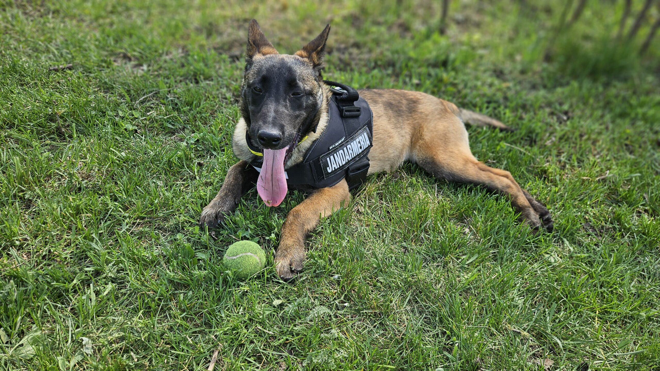 Micuța patrupedă este un ciobănesc belgian malinois are patru luni și este plină de energie și dragoste, iar în momentul de față cel mai mult îi place să se joace cu mingiuța alături de partenerul său jandarm.