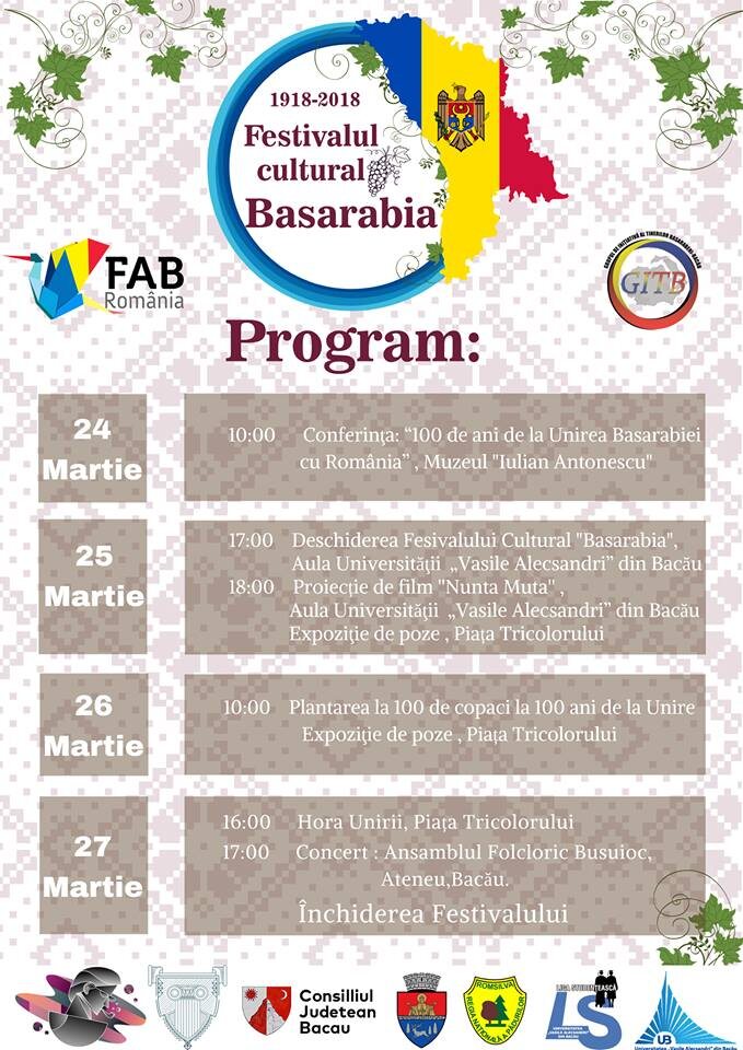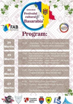 În perioada 24-27 martie, la Bacău, se va desfășura o festivitate dedicată împlinirii a 100 de ani de la Unirea Basarabiei cu România, întitulală ”Festivalul Basarabia”. Acest eveniment, care se derulează în decursul a patru zile, sărbătoreșteaniversarea Centenarului Unirii Basarabiei cu patria mamă România.