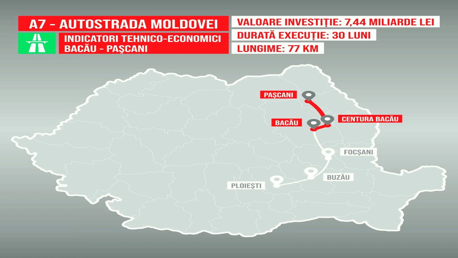 Indicatorii tehnico-economici ai autostrăzii Bacău – Pașcani (77 km), parte din viitoarea A7 „Autostrada Moldovei”, au fost aprobați în ședința de Guvern de astăzi. Urmează scoaterea la licitație a acestui sector, în vederea desemnării antreprenorului care va realiza lucrarea a cărei durată de execuție este fixată la 30 luni.