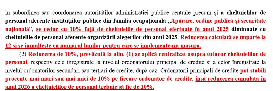 Pentru restul instituțiilor publice, proiectul prevede că cheltuielile de personal în 2026 vor fi reduse cu 10% față de nivelul din 2025, după eliminarea cheltuielilor legate de organizarea alegerilor.