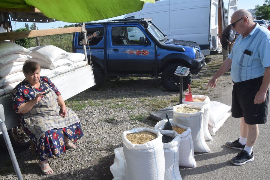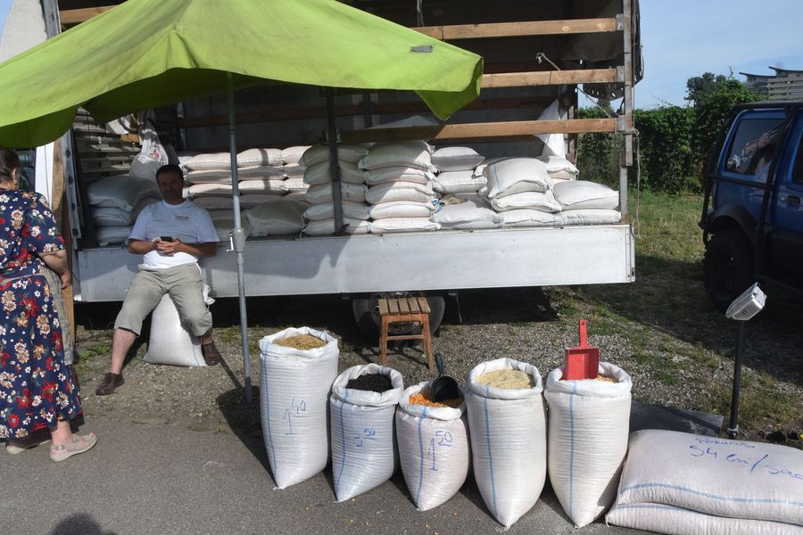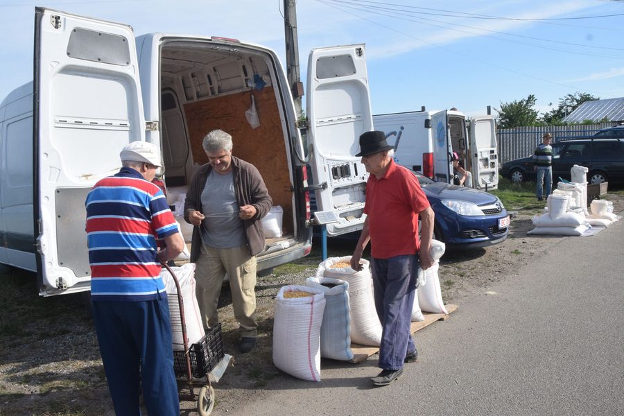Remus stă la umbra unei prelate așteptând clienți care să cumpere cantități mai mari. Vinde direct din saci: grâu, mălai, tărâțe, floarea soarelui, grăunțe de porumb… Este din Săucești:„Merge prost. Dacă o ține tot așa încă doi ani cred că mă las. Nu ne ajută statul. Suntem asociați mai mulți. Avem și pământul nostru, și luat în arendă. Acum, față de anul trecut, îngrășămintele sunt dublu. Ureea era doi lei cinzeci, acum au făcut-o cinci. Motorina cinci lei și ceva, azi e peste nouă lei. Cum să-ți mai scoți munca?” În spatele altei mașini, doi oameni mai în vîrstă încearcă o tocmeală cu producătorul. Sunt clienți vechi. Gheorghe și Vasile.