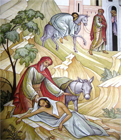 Din întâmplare, un preot cobora pe calea aceea şi, văzându-l, a trecut pe alături. Tot așa şi un levit.. Dar un samarinean, văzându-l, i s-a făcut milă. Apropiindu-se, i-a legat rănile, turnând pe ele untdelemn şi vin, şi, punându-l pe asinul său, l-a dus la o casă de oaspeţi şi a purtat grijă de el. Iar a doua zi, scoţând doi dinari, i-a dat gazdei şi i-a zis: Ai grijă de el şi, ce vei mai cheltui, eu, când mă voi întoarce, îţi voi da. Care dintre aceştia trei ţi se pare că a fost aproapele celui căzut între tâlhari? Tânărul rosti: Cel care a făcut milă cu el. Iisus încheie: Mergi şi fă şi tu asemenea!” (25-37)