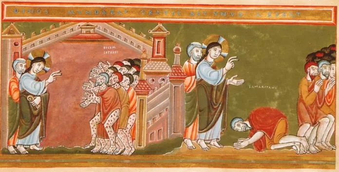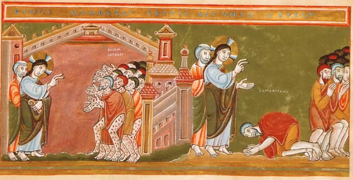 Dăruită tocmai de un medic sfânt, Apostolul Luca, pericopa evanghelică a sfârșitului săptămânii, care însumează doar șapte versete (Lc. 17, 12-19), ne plasează alături de Mântuitorul Hristos în cea din urmă călătorie către Ierusalimul pătimirilor Sale. Undeva, în hotarul dintre Galileea și Samaria cea schismatică, înspre ținutul Pereii, la margine de cetate, într-un dialog despre puterea tămăduitoare a iertării, ce pare a fi întrerupt doar de vocile indezirabile și subnutrite a zece persoane care abia mai găsesc puterea să strige: „Iisuse, Învățătorule, fie-ți milă de noi!”. Cel mai probabil, o solicitare standard a celor ignorați și alungați din comunitate, care-și pierduseră chipurile și-și rătăceau acum nemurirea. Neputința fizică îi condamnase la a cerși bruma de existență zbuciumată… Dar Domnul îi vede. Le citește inimile și-i primește în minunea milei Sale. Pentru ei venise, deși ei nu știau. Le testează încrederea. Îi trimite la Templu pentru a primi dreptul de integrare în viața socială. Îi socotește deja vindecați. Nu întâmplător, relatarea lucanică ne arată cum, pe cale, solzii leprei se desprind din pielea bătucită de boală, indiferență și neiubire. Nouă își continuă drumul. Împlinesc porunca. Unul, al zecelea, nu se apropie de templu, samarinean fiind. Dar revine „cu glas mare slăvind pe Dumnezeu”, și cade la pământ, mulțumind iudeului ce-L vindecase. Lui, Mântuitorul îi explică vindecarea: „Scoală-te și du-te, credința ta te-a mântuit!”. Și-i deschide Împărăția: „Ridică-te și mergi!”. Domnul cercetează și ingratitudinea celor nouă, pentru a-i pune pe gânduri pe ucenicii prezenți, dar și pe noi, cei de peste veacuri. Vindecați de cangrena trupească, aceștia au fost răniți de lepra nerecunoștinței.