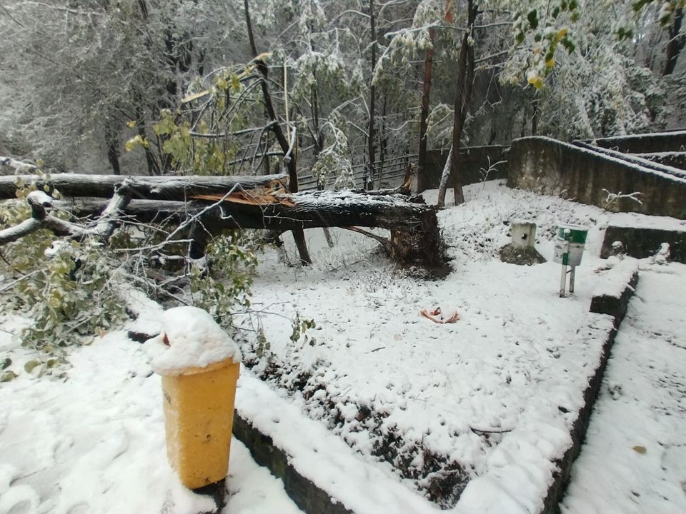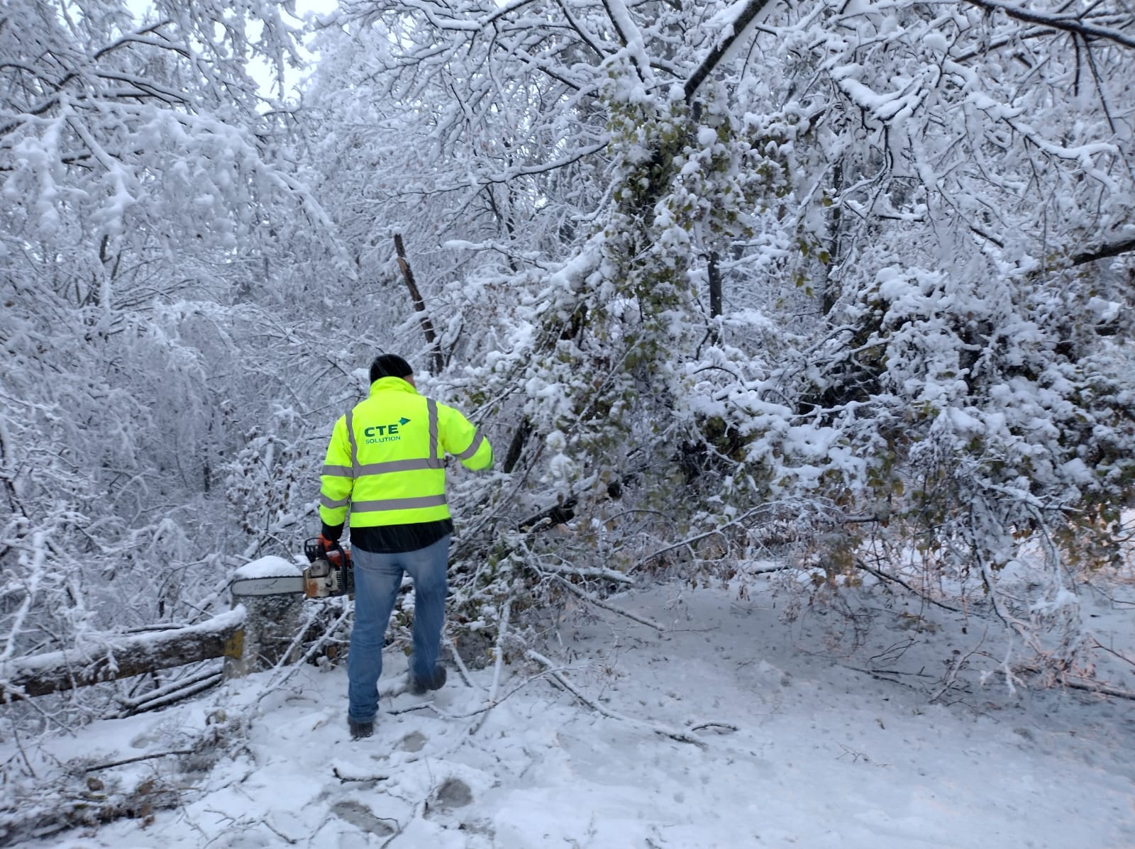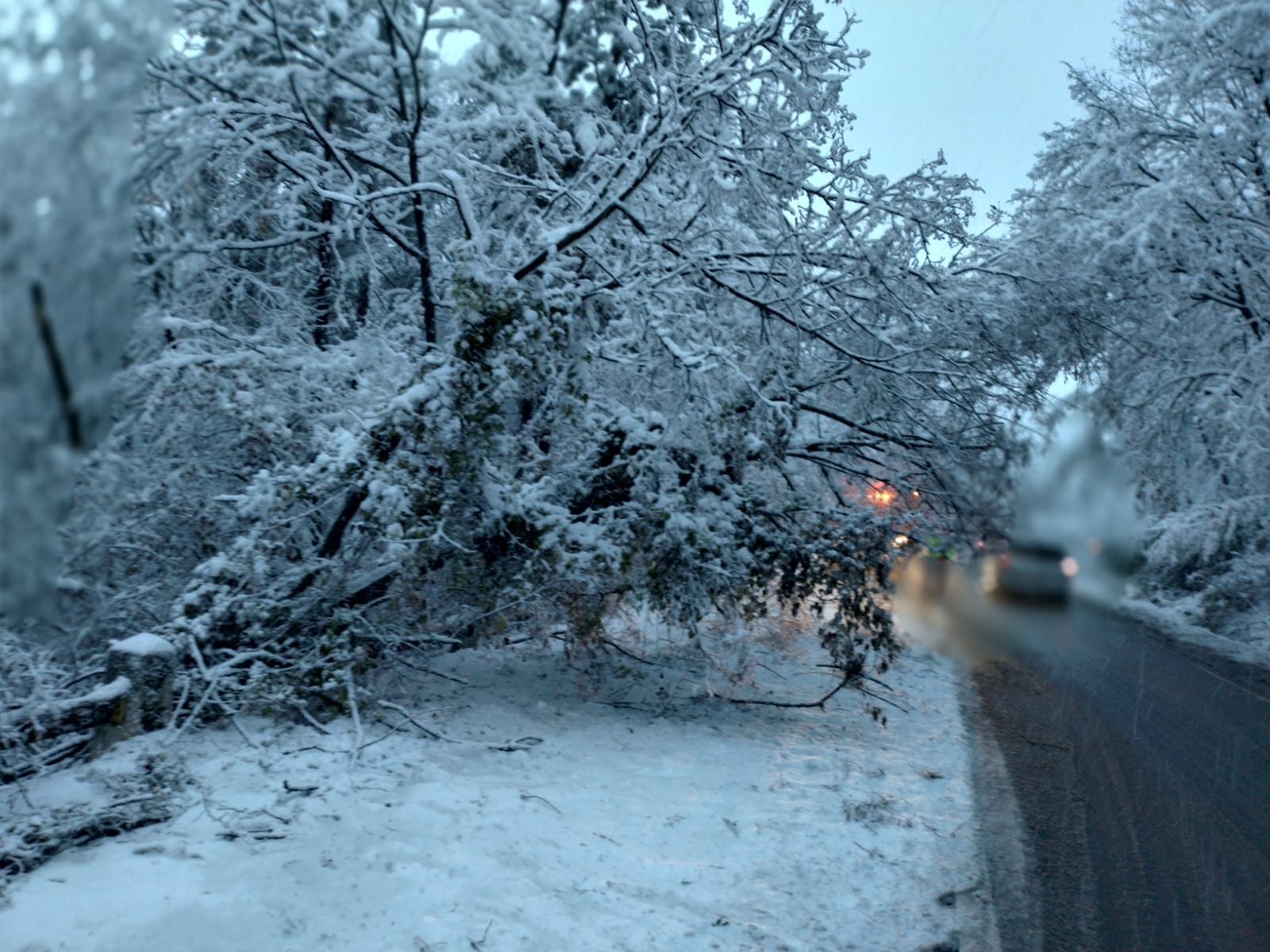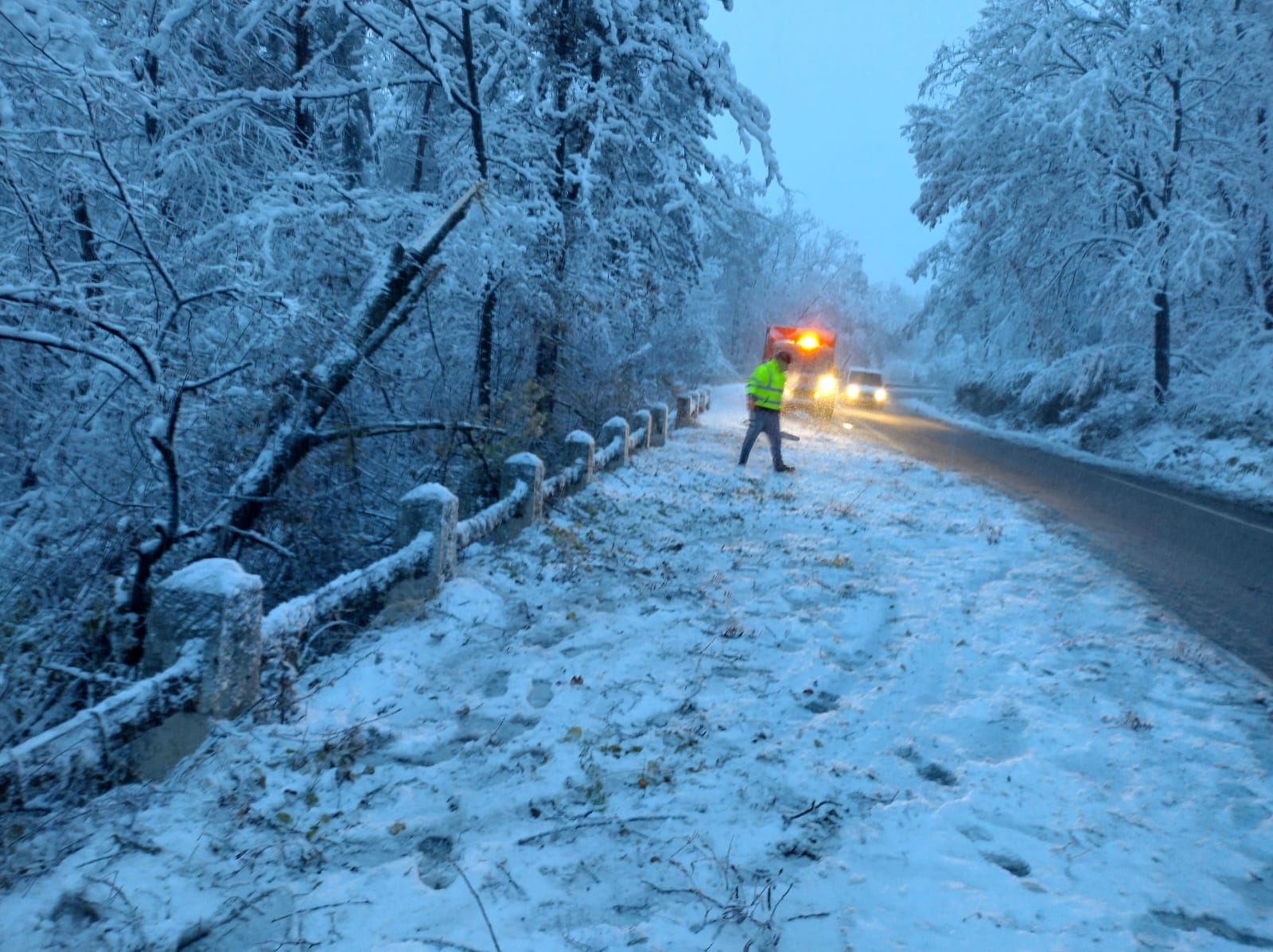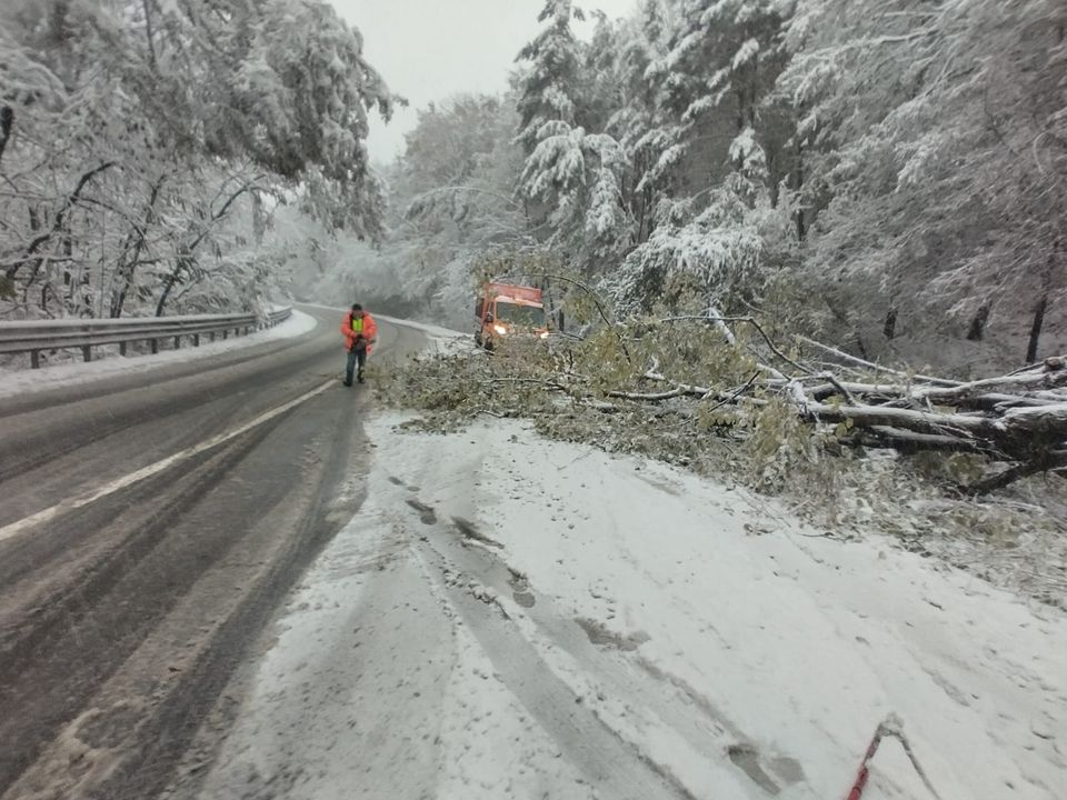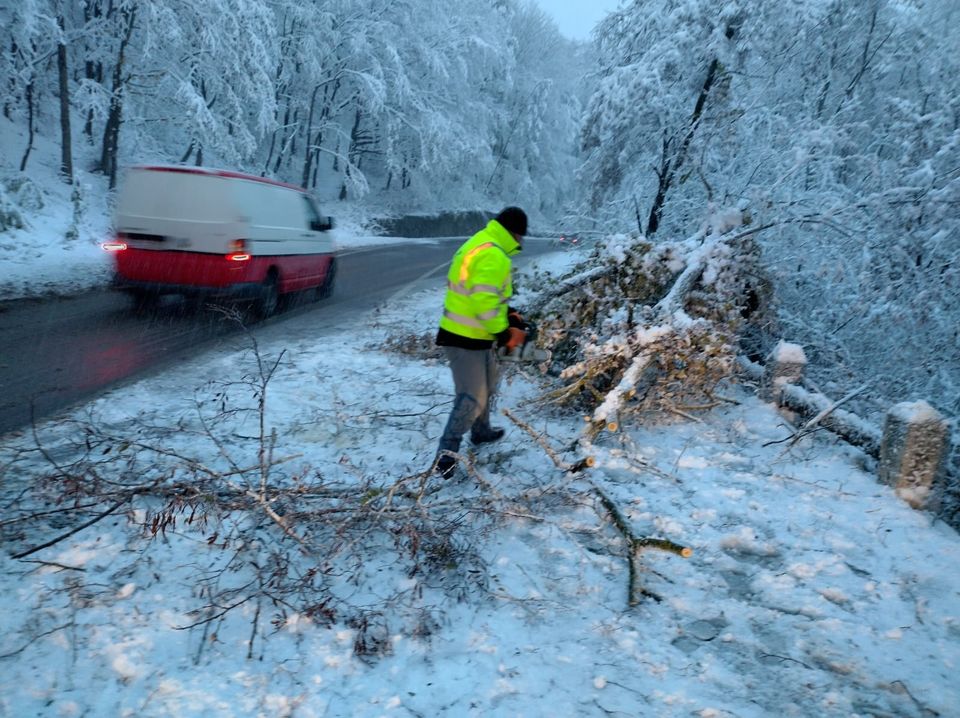 Intervenții ale echipelor DRDP Iași pentru înlăturarea unor arbori doborâți sub greutatea zăpezii pe DN 11, Măgura, județul Bacău. Traficul în zonă a fost blocat temporar, în vederea degajării carosabilului de către lucrătorii Districtului Bacău 1.