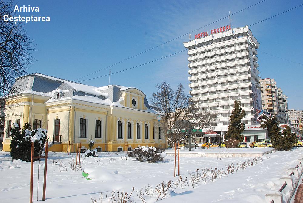 În plan secund apare Hotelul Decebal, una dintre clădirile-emblemă ale orașului în perioada postbelică. Construit în anii dezvoltării urbane socialiste, hotelul domina și domină încă peisajul central prin volumetria sa masivă. Contrastul dintre arhitectura clasică a bibliotecii și liniile moderne ale hotelului este evidențiat și mai clar de uniformitatea albă a zăpezii, care estompează detaliile urbane și pune în valoare formele.