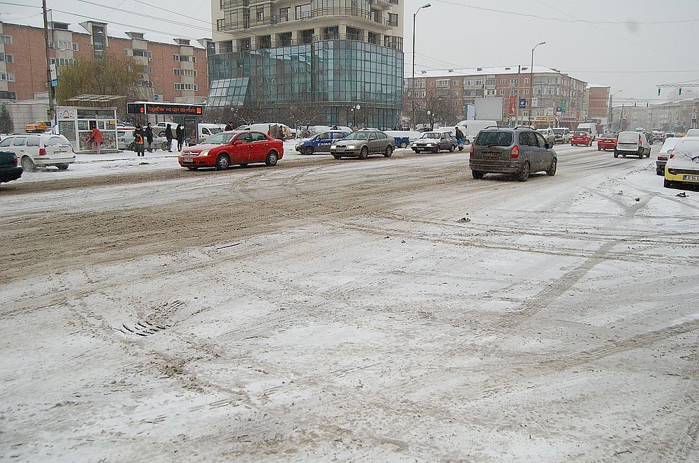 La finalul anilor 2000, iernile „clasice”, cu zăpezi abundente și ger prelungit, începeau să fie percepute tot mai mult ca o amintire. Cu toate acestea, episoadele de ninsoare, chiar și moderate, continuau să pună la încercare infrastructura urbană. Imaginea arată carosabilul acoperit de un strat de zăpadă amestecată cu noroi și gheață, rezultat al traficului intens și al intervențiilor parțiale de deszăpezire. Benzile de circulație sunt vizibile mai degrabă prin urmele lăsate de roți decât printr-o curățare completă, iar aderența redusă impunea prudență sporită șoferilor.