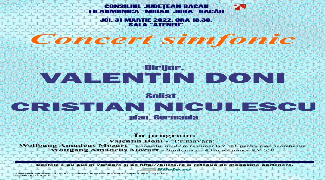 Aseară, în cadrul stagiunii camerale Serile Syrinx, Cristian Niculescu a interpretat Sonata op.42 în la minor de Franz Schubert, 3 Intermezzi op.117 de Johannes Brahms, Carillon Nocturne de George Enescu și Preludii de Claude Debussy. Pentru finalul programul concertului simfonic, Valentin Doni, ce se va afla la pupitrul dirijoral, a ales o capodoperă, Simfonia nr.40 în sol minor, KV 550, lucrare finalizată în iulie 1788 de către Wolfgang Amadeus Mozart. Incontestabil, Simfonia 40 și-a câștigat locul cel mai important în ordinea preferințelor, devenind celebră. Nu suntem adepții clasamentelor, dar statisticile confirmă supremația penultimei simfonii compuse de Mozart, cu trei ani înainte de a muri. Scria Emil Cioran, „Când ascult această muzică de Mozart, îmi cresc aripi de înger”.