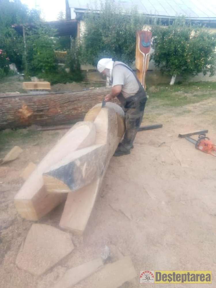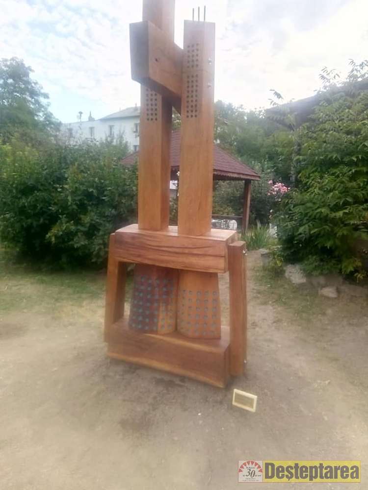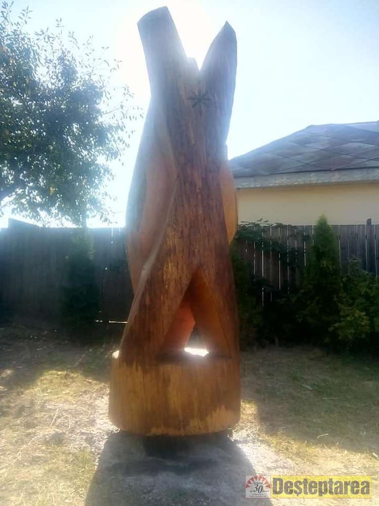 Dumitru Verdianu, artistul hâtru şi tandru pe care nu te poţi abţine să-l compari cu un fel de Ion Creangă al sculpturii româneşti, a realizat în mai puțin de zece zile o lucrare complexă intitulată „Ying şi Yang”, exploatând inspirat generosul trunchi de stejar oferit. Compoziţia în ronde-bosse alătură pe suprafeţele ei o serie de sugestii şi simboluri: masculinul şi femininul ca principii ordonatoare, triunghiul şi sfera ca forme geometrice fundamentale, dar conţine şi o convingătoare trimitere către religios prin acea pronunţată „Cruce a Sfântului Andrei” ce se desprinde cu fermitate din trunchiul voluminos al arborelui. Sculptorul intervine minimal asupra suprafeţelor, abia decojite, pentru a potenţa frumuseţea texturii naturale a materialului. Lucrarea lui Verdianu ne duce cu gândul la androginul originar şi, implicit, la începuturile lumii, la Geneză. Nu mai puţin, ea este un omagiu adus lui George Apostu şi spaţiului renăscut de la Stănişeşti.