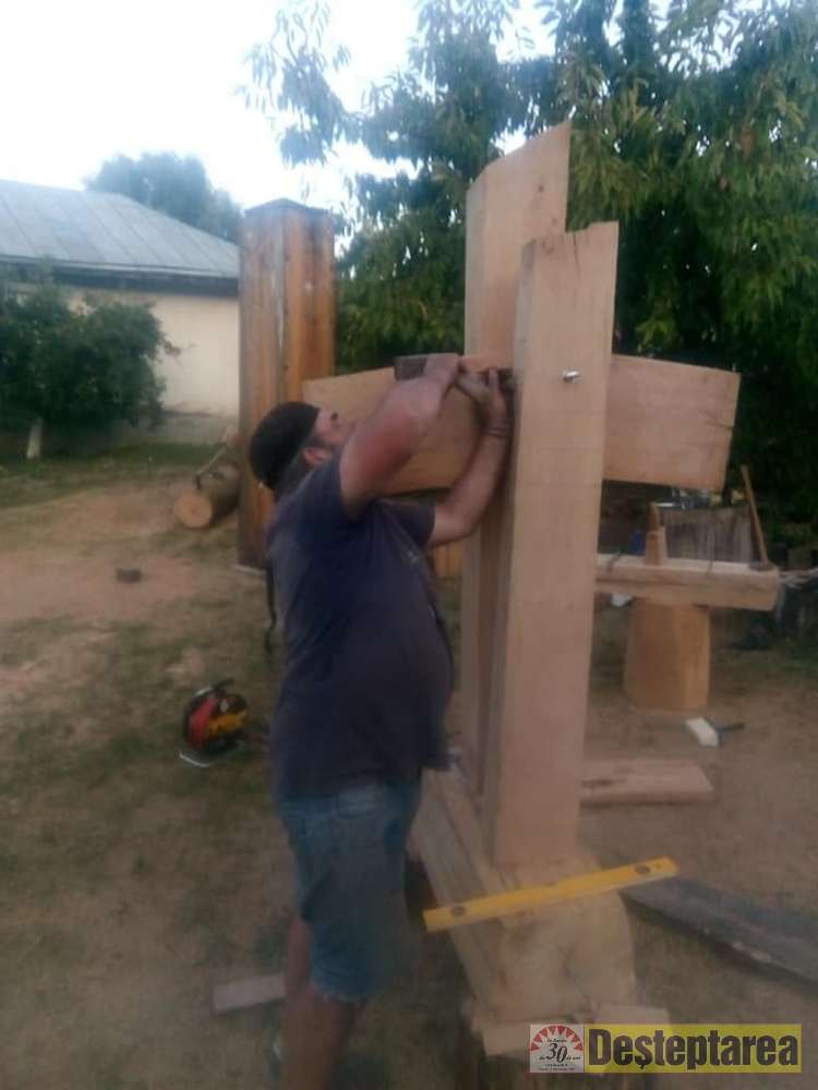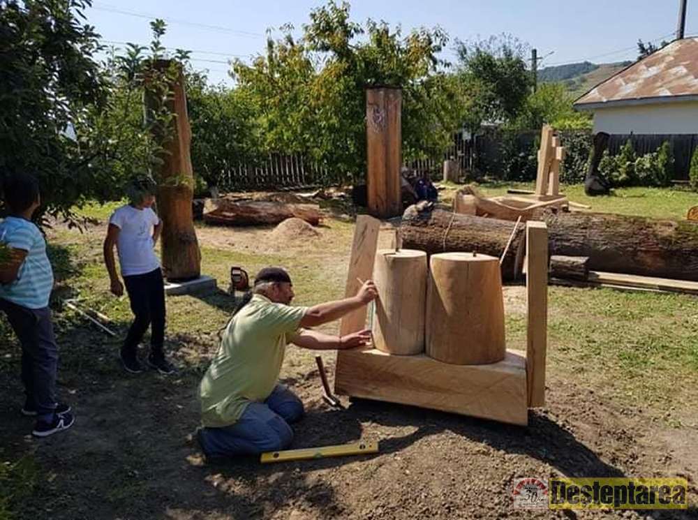 Valentin Vârtosu, artist întru totul dedicat menirii sale, în a cărui privire am putut citi o bucurie de a sculpta imposibil de ascuns, s-a confruntat la rândul său cu un trunchi masiv de stejar căruia i-a dăruit o nouă viaţ, transformându-l în compoziţia cu titlul „Un Dorumetru Tată şi Fiu”. Seria atât de poetic şi de sugestiv intitulată „Dorumetre” reprezintă un fel de marcă identitară a sculptorului Valentin Vârtosu. Ciclul „Tată şi Fiu” a fost, de asemenea, o marcă a creaţiei lui George Apostu, interpretată în mai multe chei (raportarea lui Apostu ca fiu la tatăl biologic, raportarea sculptorului la Brâncuşi, înaintaşul său ori sugestia legăturii sacre dintre Dumnezeu Tatăl şi Hristos Fiul). În felul acesta, Vârtosu izbuteşte să pună în proiect o dublă intenţie: de a-l omagia pe George Apostu şi de a-i dărui, din toată inima lui mare, un „Dorumetru”. Lucrarea în sine, o compoziţie verticală, bine echilibrată, dă expresie principiului dublului în suprafeţe clar desprinse din masa lemnului dar, pe de altă parte, prin intermediul acestui dublu alcătuit din perechea Tată-Fiu, artistul sugerează şi Crucea ce devine axă între pământ şi cer. Spre deosebire de Dumitru Verdianu care tratează mai frust suprafeţele, Valentin Vârtosu se opreşte asupra lor cu migală, adăugând texturii naturale o alta alcătuită dintr-o reţea de mici cercuri tratate inclusiv cromatic.
