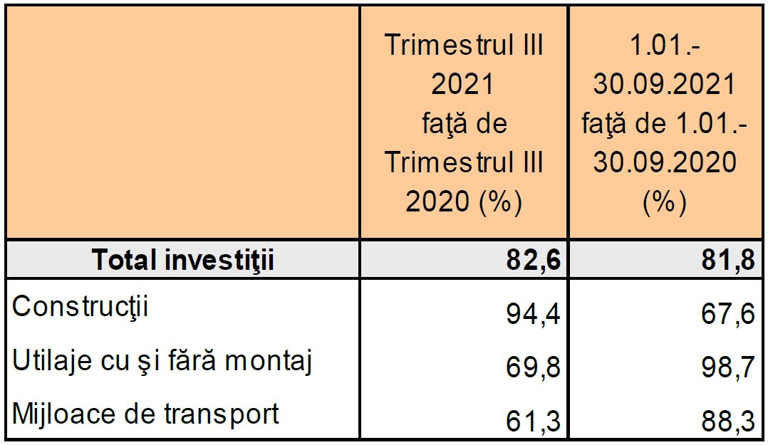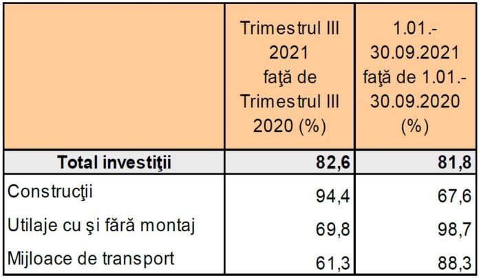 Dacă pentru primele trei trimestre din 2021 investițiile au scăzut cu 18,2 la sută față de perioada similara din 2020, să notăm că pe primele trei trimestre din 2020 volumul de invetiții a fost cu 30,4% mai mare faţă de perioada corespunzătoare din anul 2019. RB