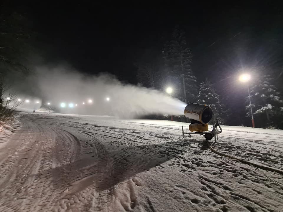 Zăpada artificială produsă în ultimele zile acoperă aproximativ 70% din suprafața schiabilă și urmează să fie nivelată și răspândită pe pârtie.