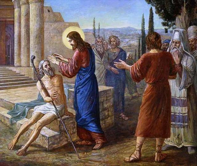 … iată elemente care fac din Ierihon o cetate de poveste, ce este atinsă iarăși de Mântuitorul, spre a o putea înscrie în Cer. O zi aparent obișnuită pentru toți. Nu și pentru Bartimeu, fiul lui Timeu (Marcu 10, 46-52), orb din naștere, întărit doar în credință, care simte mireasma și cere Lumina pe care o simte izvorând din Hristos. Un fiu orb ce strigă. Către Un Fiu, Unul Născut, care nu ceartă, nu acuză și nu judecă circumstanțe. Doar oprește, privește cu milă, se apleacă spre neputință, întreabă, pentru a nu da loc interpretărilor, și primește răspunsul vieții: Doamne, vreau să văd! Iar Domnul, precum odinioară, la Început, biruiește nevederea… O uluitoare simplitate de gest și de cuvânt. Tânărul se ridică, vede Lumina – Hristos și înțelege faptul că trebuie să trăiască în Lumina credinței. Este vindecat trupește și sufletește.