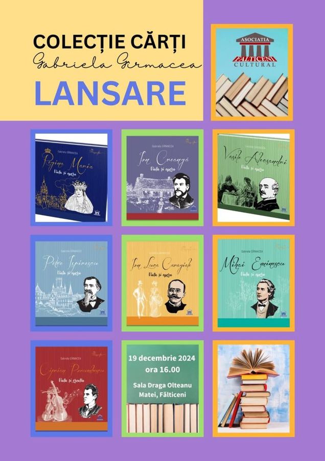 Nu cu mult timp în urmă, la Târgul de carte ,,Gaudeamus”, care a avut loc în București, între 4 – 8 decembrie 2024, scriitoarea Gabriela Gîrmacea a reușit performanța de a-și lansa în zilele de 6 și 7 decembrie, ultimele trei cărți ale sale: ,,Vasile Alecsandri – Viața și opera”, Editura ,,Didactica Publishing House” din București (6 decembrie și a șasea carte din seria ,,Biografii); ,,Cărțile copilăriei noastre” (coordonator), Editura ,,Magic Print” din Onești (6 decembrie); ,,Regina Maria -Viața și opera”, Editura ,,Didactica Publishing House” (7 decembrie și a șaptea și cea mai recentă carte din seria ,,Biografii”).